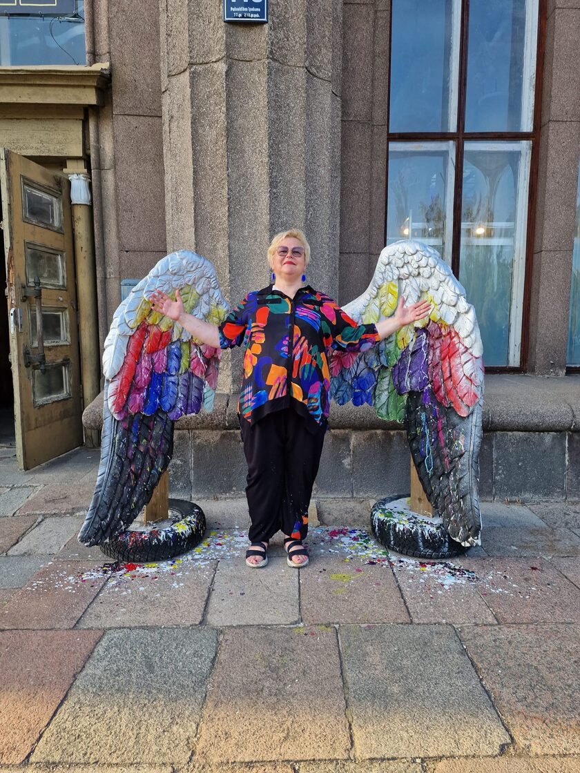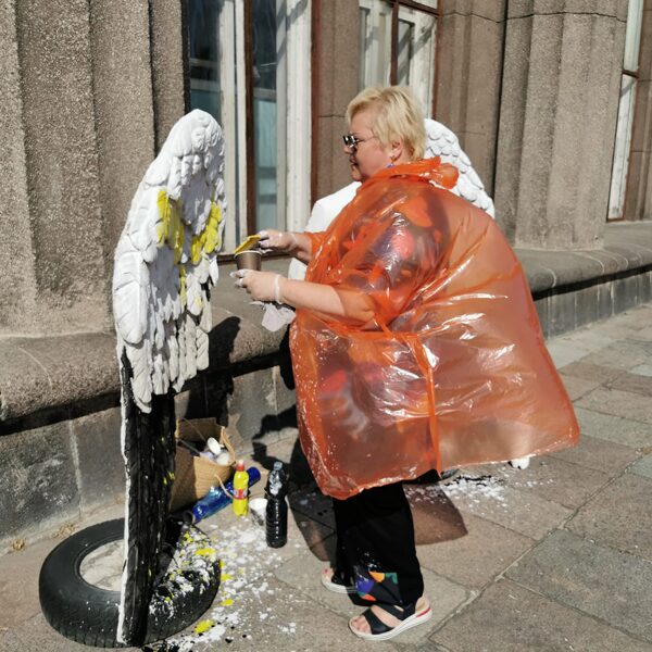 Pie ēkas Street art pasākuma ietvaros spārnu apgleznošana.